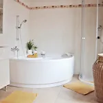 El Ferienwohnung Am Park Fewo1 cuenta con 1 dormitorio. El alojamiento tiene 1 cuarto de baño. Además, dispone de una bañera, un inodoro separado y una ducha.